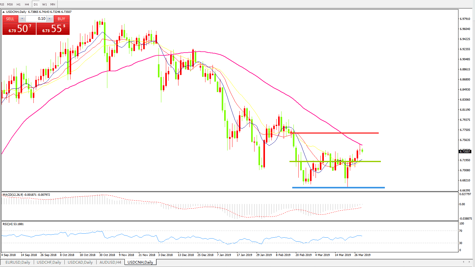 交易策略6.6990之上,看涨,目标价位为6.7845,然后为6.8185