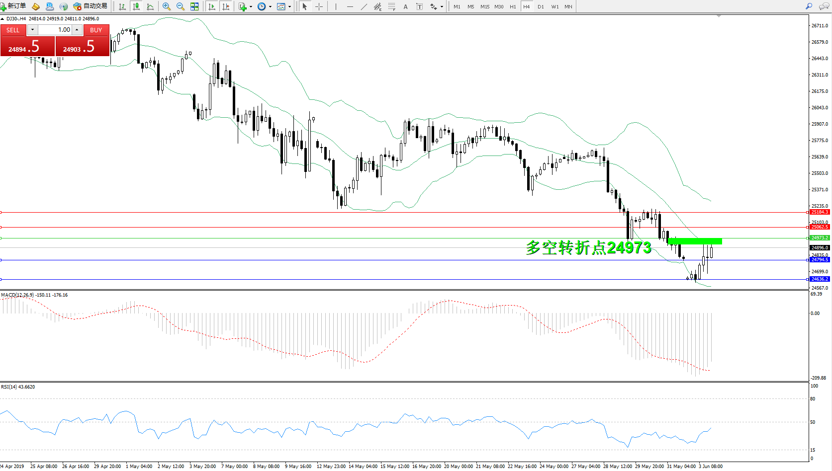 道琼斯指数DJ30—— 4小时K线图显示: