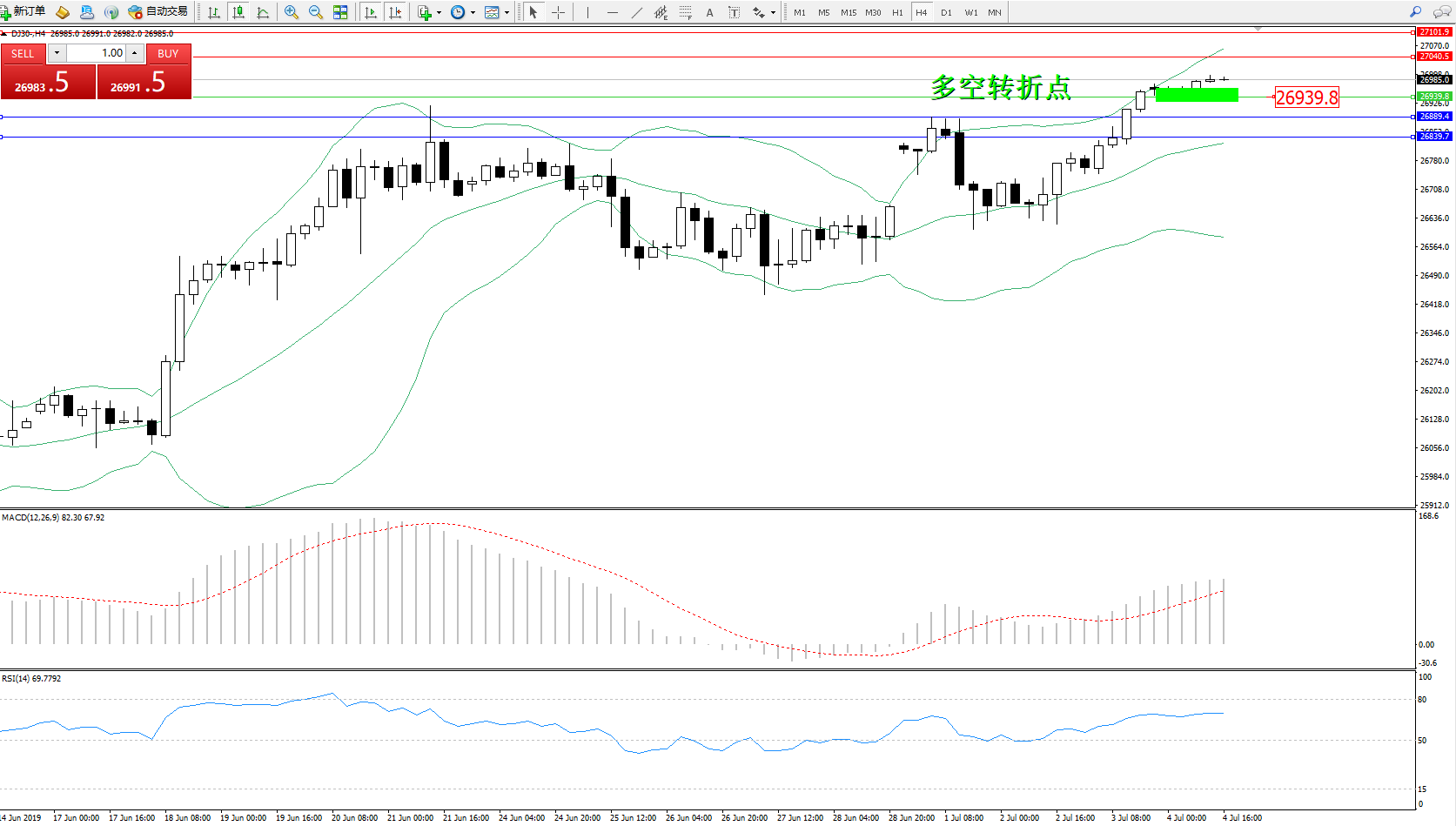 道琼斯指数DJ30—— 4小时K线图显示: