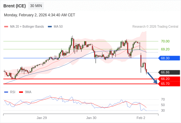 交易策略: 在 68.30 之下,看跌,目标价位为 66.20 ,然后为 65.70 。