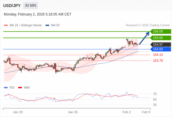 在 154.60 之上,看涨,目标价位为 155.50 ,然后为 156.00 。