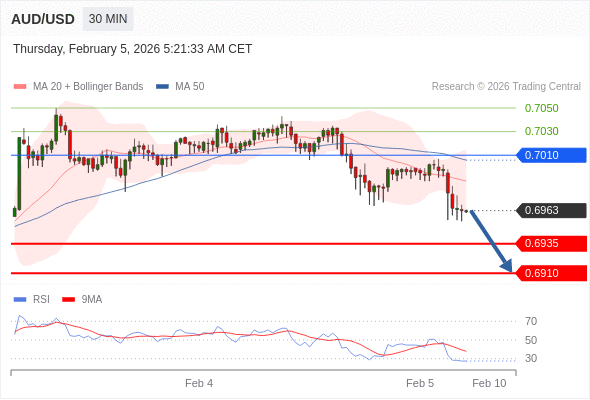在 0.7010 之下,看跌,目标价位为 0.6935 ,然后为 0.6910 。