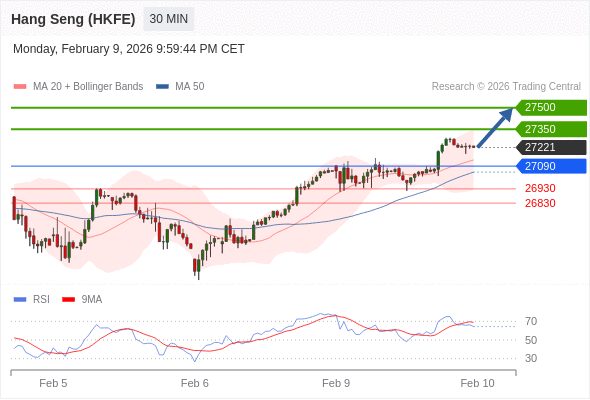 在 27090 之上,看涨,目标价位为 27350 ,然后为 27500 。
