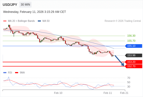 在 155.10 之下,看跌,目标价位为 153.20 ,然后为 152.70 。