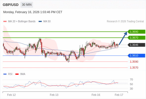 在 1.3610 之上,看涨,目标价位为 1.3670 ,然后为 1.3690 。