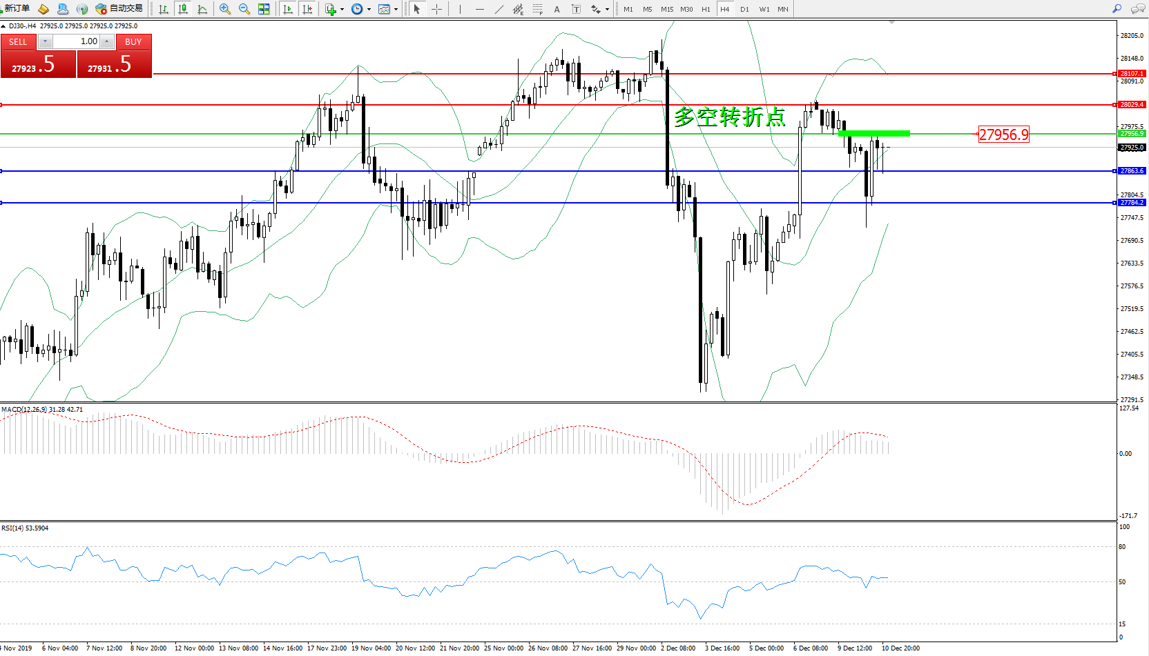 道琼斯指数DJ30—— 4小时K线图显示: