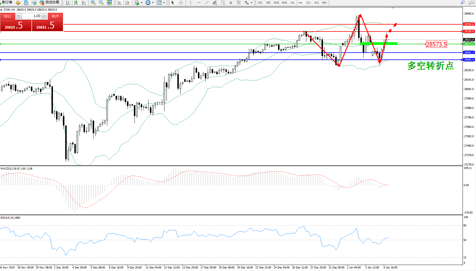 道琼斯指数DJ30—— 4小时K线图显示: