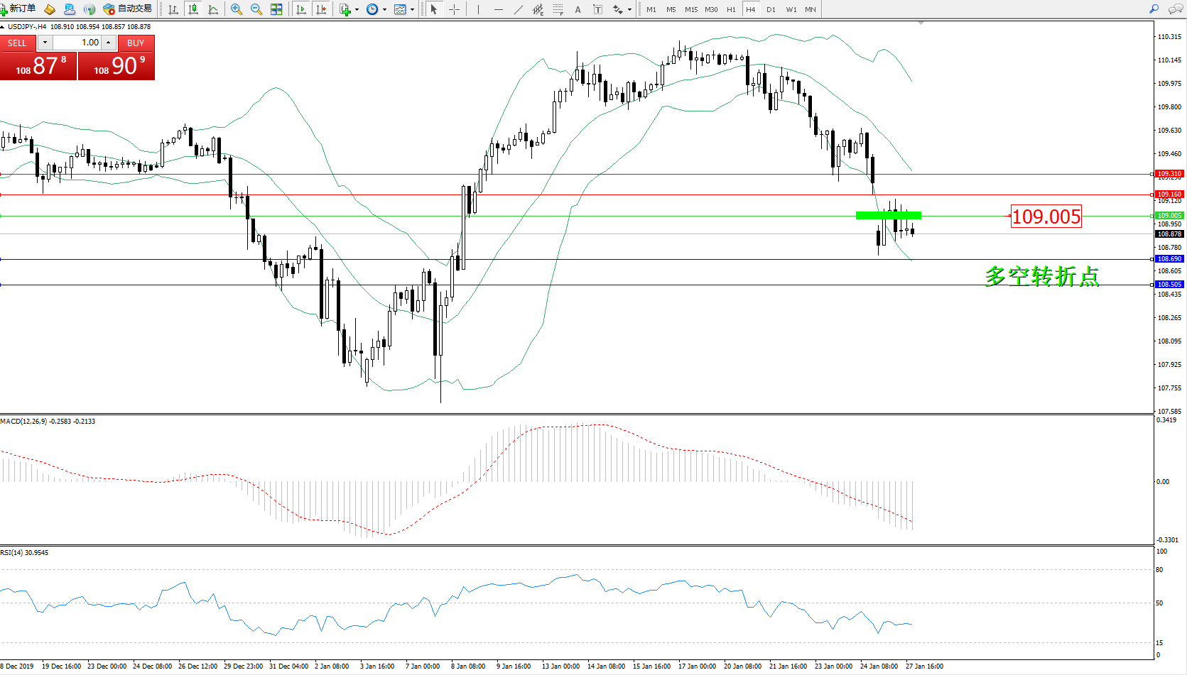 交易策略:109.005下方看跌,目标108.690、108.505