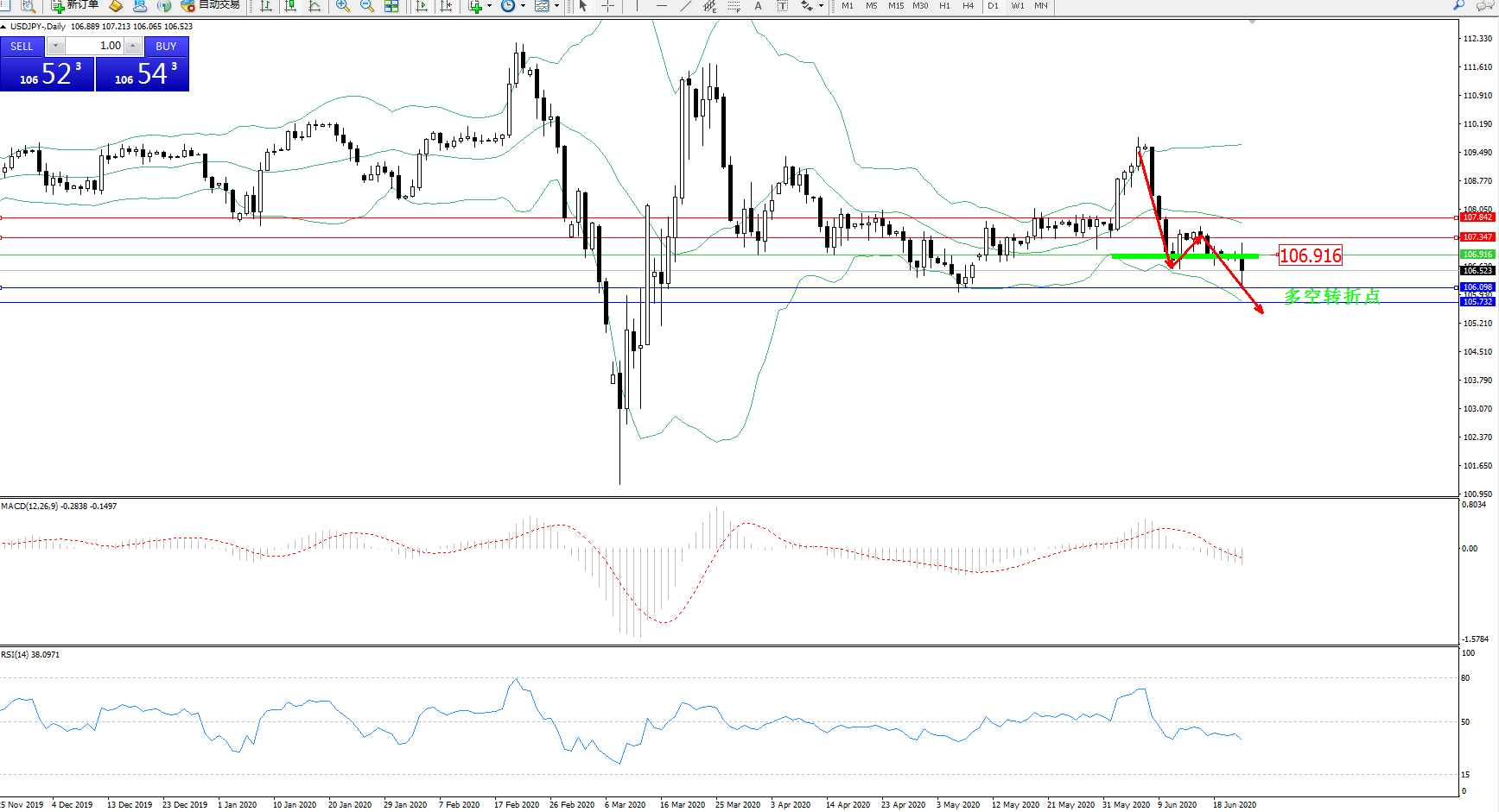 交易策略:106.916下方看跌,目标106.098、105.732