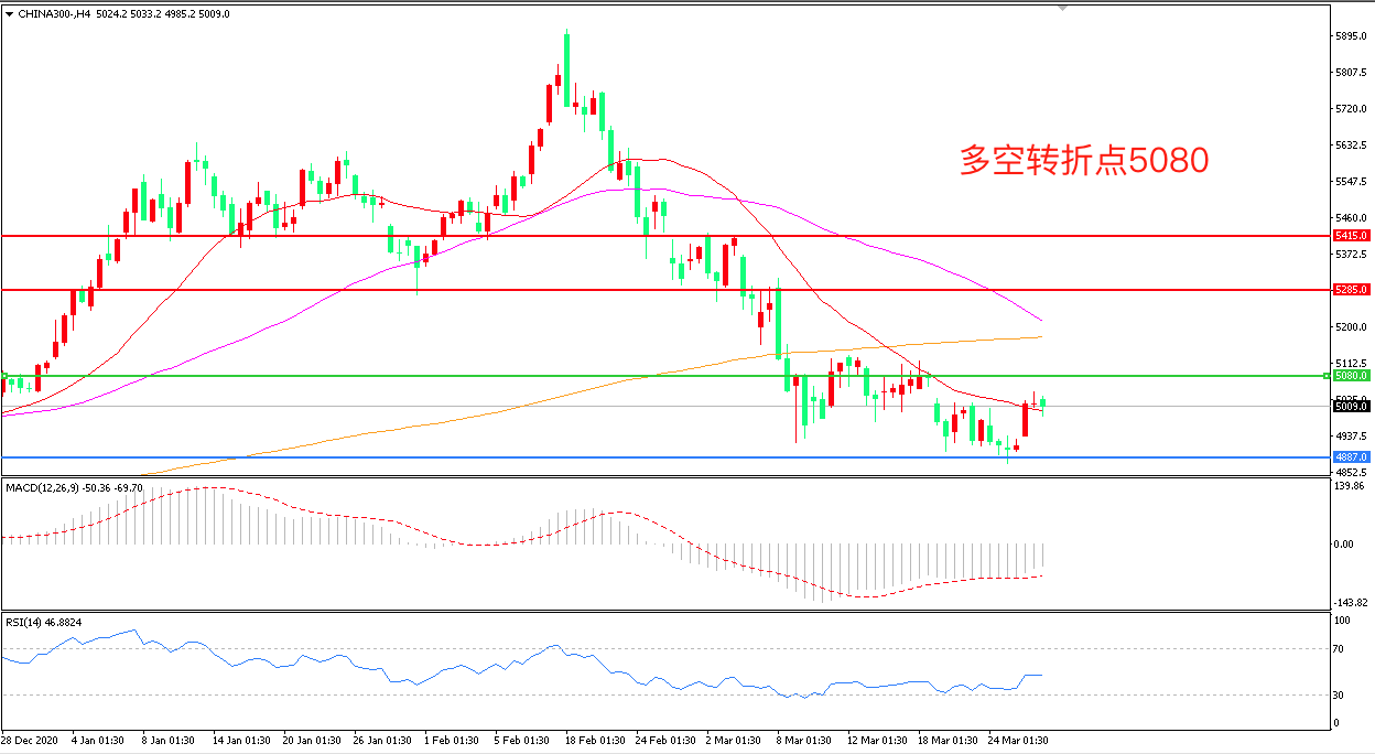 4小时图看,沪深300低位高开高走,短期看有止跌迹象,但整体来看依然处于空头形态之中,5080成为上方阻力,4875成为下方支撑,MACD绿柱缩短,RSI指标走平日内延续震荡概率较大。