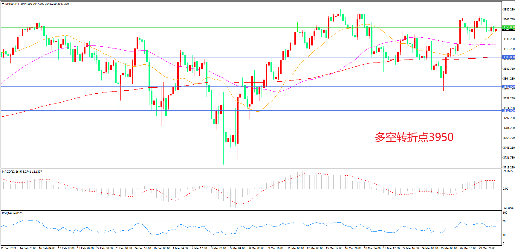 4小时图看,标普500冲高回落,围绕3950附近展开高位震荡,21周期均线成为短期支撑,MACD红柱缩短,RSI指标走平,日内延续震荡概率较大。