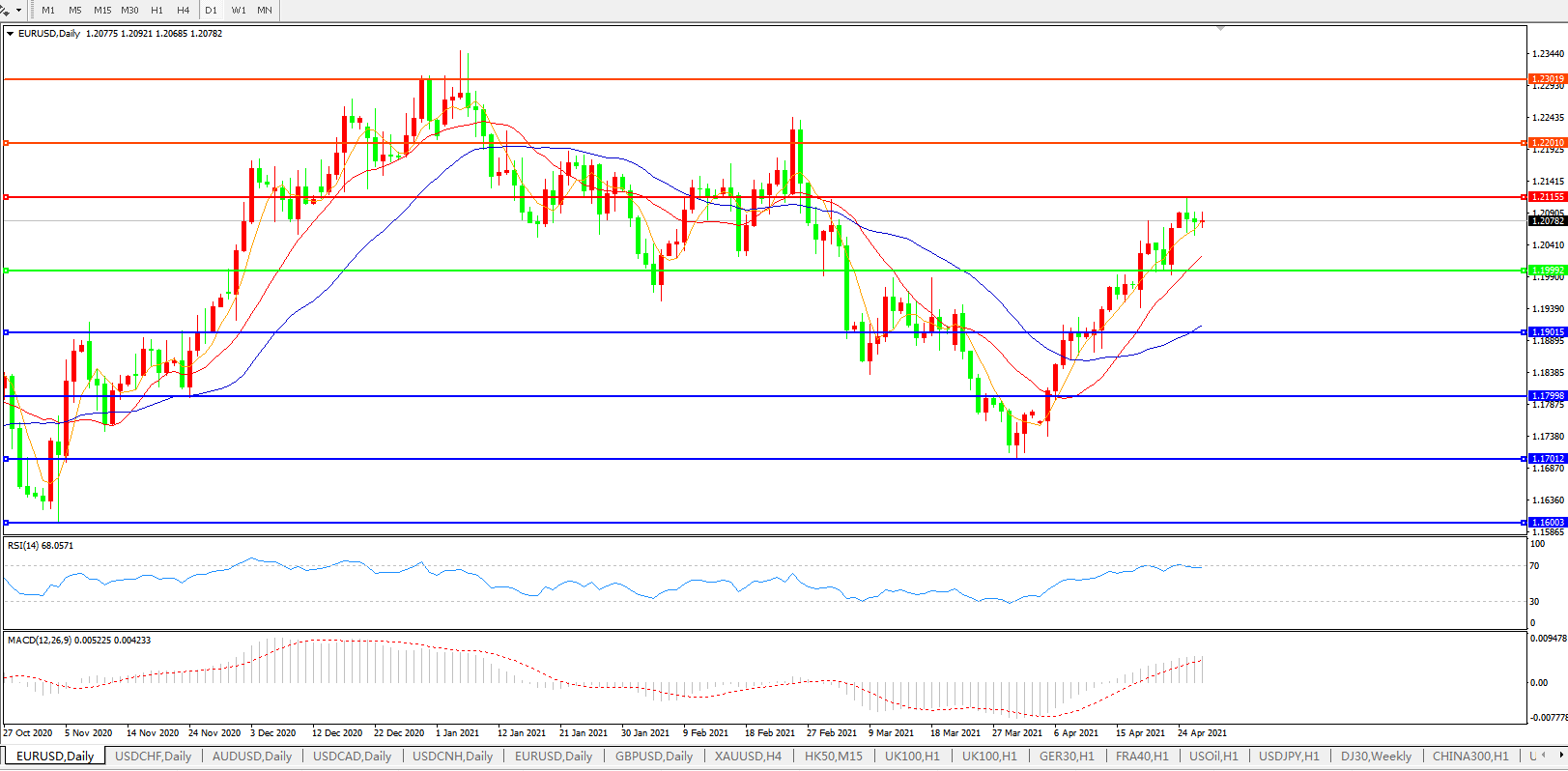 技术面简析:日图均线呈多头排列,汇价持续发力上行,MACD上穿0轴且量能有持续放量迹象,RSI超买区域附近徘徊,预计短期汇价大概率将在整理后进一步上行。