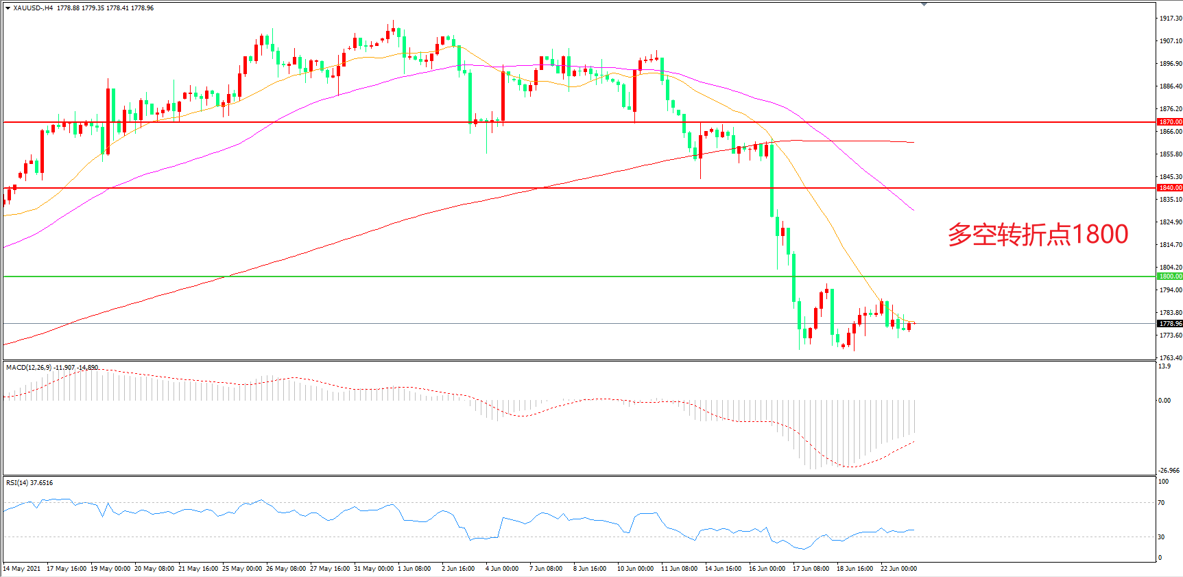 交易策略:在1800.00之下看跌,目标1760.00 1730.00