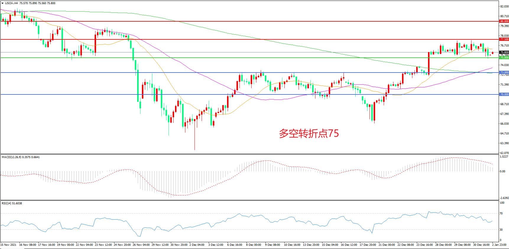 交易策略:在75.00之上看涨,目标77.50 80.00