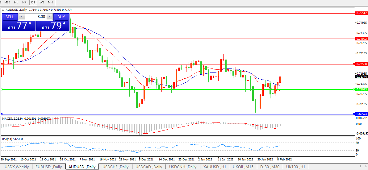 交易策略:0.7100上方看涨,目标0.7250、0.7400