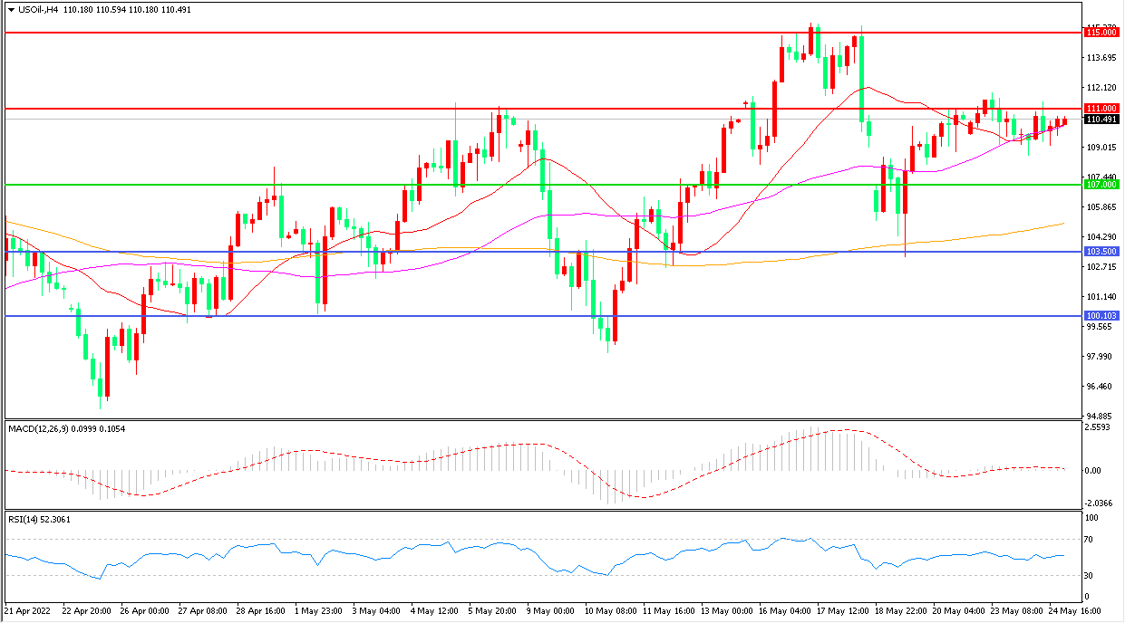 4小时图看,油价以111美元为多空分水岭窄幅震荡,横盘迹象明显,均线系统走平,MACD红柱缩短,RSI指标走平,日内小幅上行概率较大。
