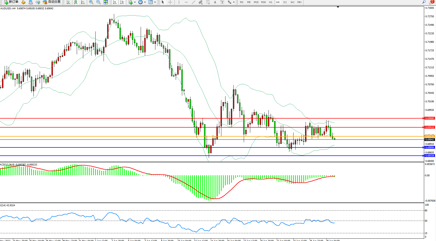 交易策略:0.69139下方看跌,目标0.68806、0.68558