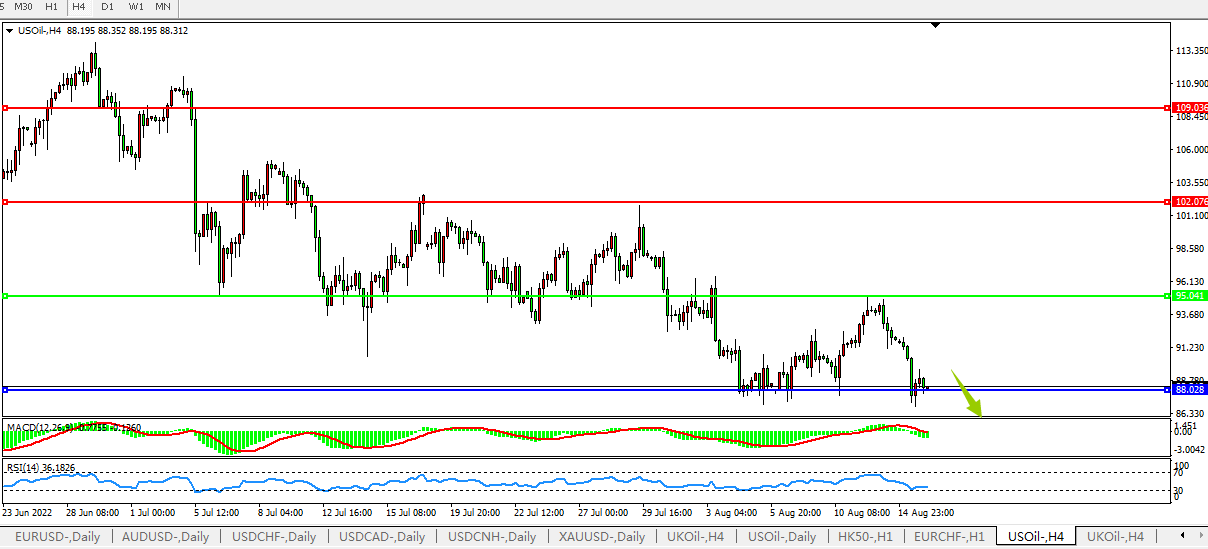 4小时图看:油价反弹触压后连续骤跌, MACD量能柱0轴下方放量,RSI指标快速回落,短期价格反弹后再度下行概率较大。