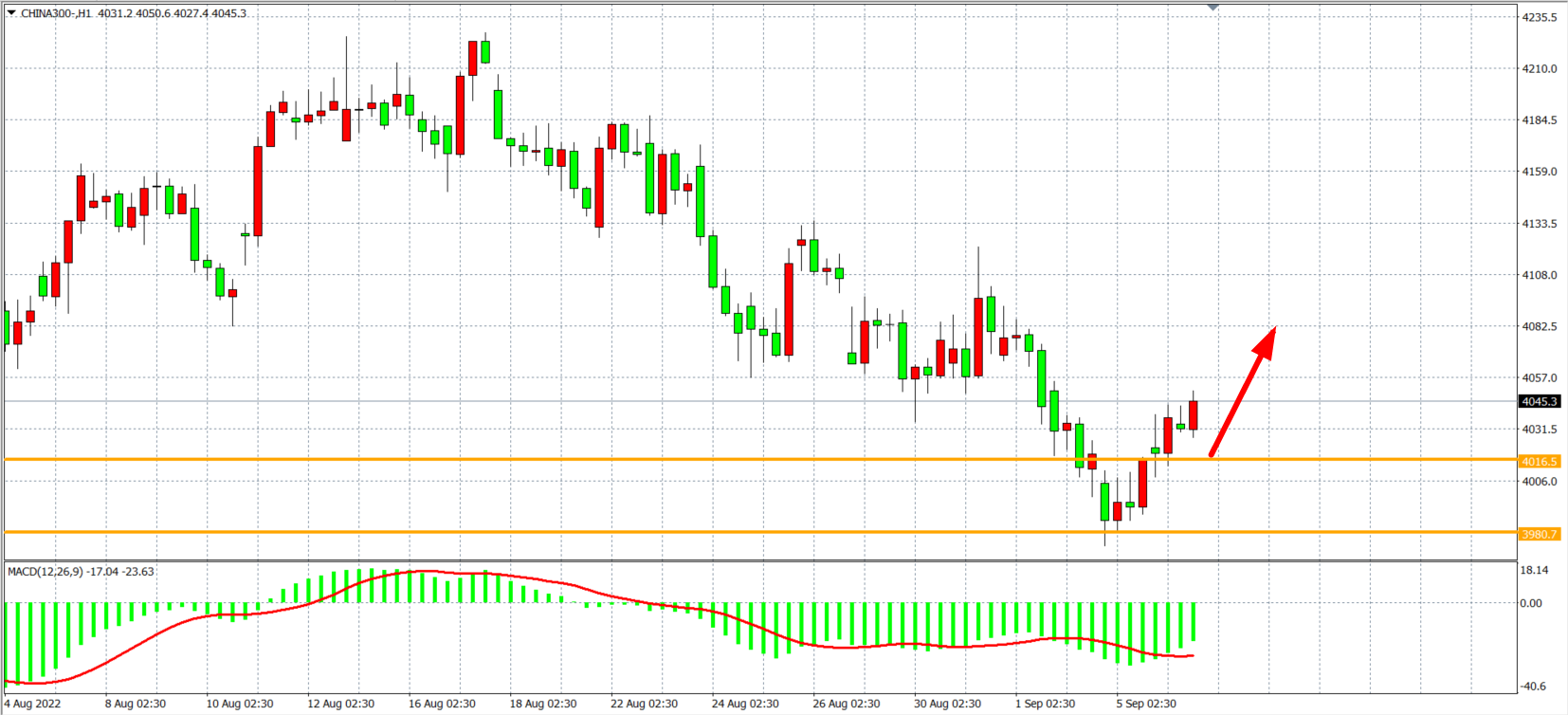 1小时图看,沪深300延续反弹走势,在4000点之上再度走强,MACD于零轴之下量能有效缩小,显示趋势或进入反抽阶段,目前短线支撑已上移至4016,日内在该位之上继续看反弹,上方目标4080-4150