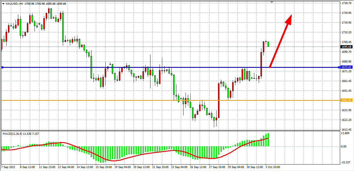 4小时图看,金价上破1675的压力一气呵成上涨,涨势再度得到确认,MACD于零轴之上急剧放量,显示多头趋势走强,强压力1675已转化为前支撑,维持在此上方继续看涨为主,上方目标1700-1730。