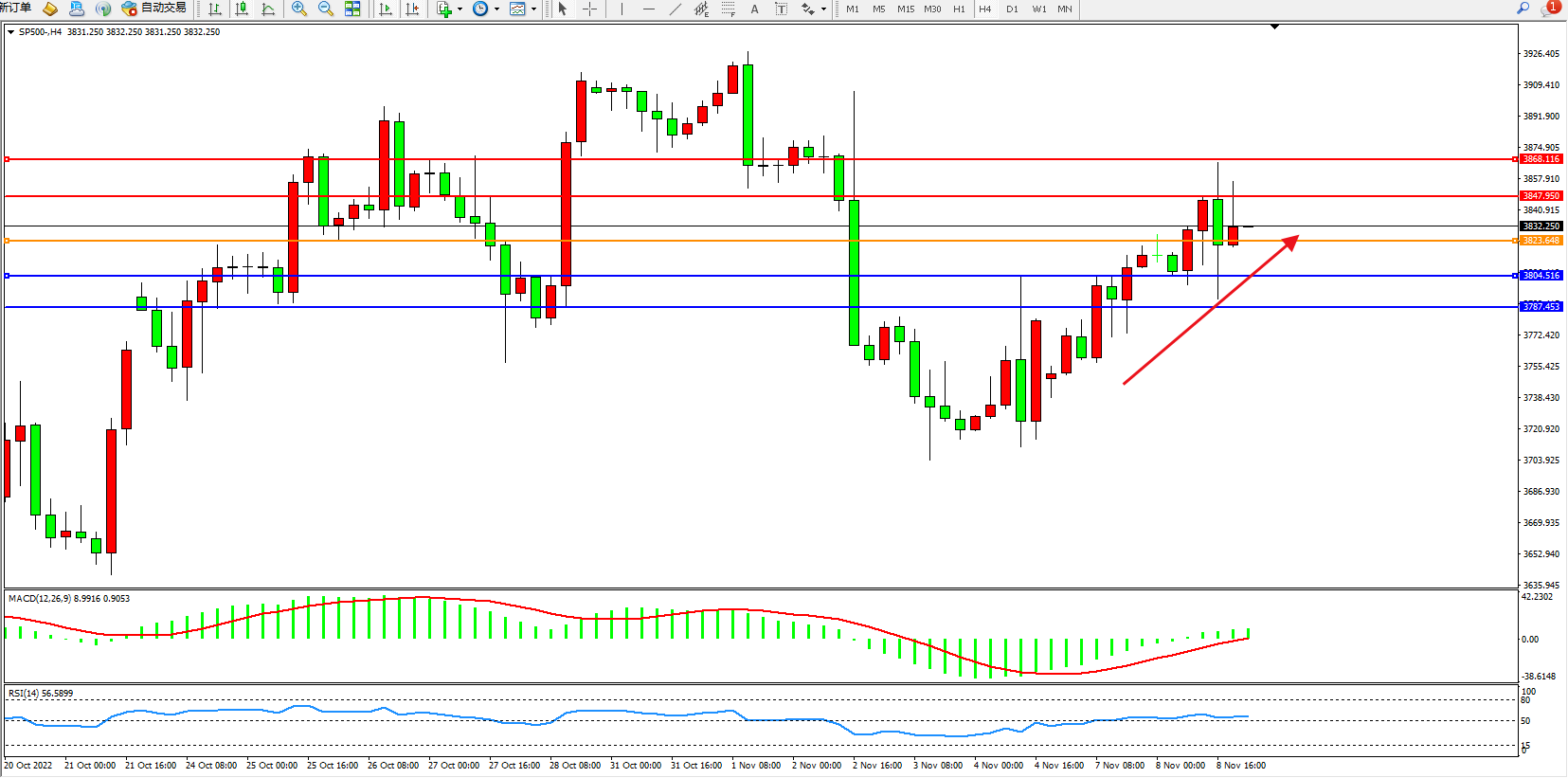 标普SP500——4小时K线图显示: