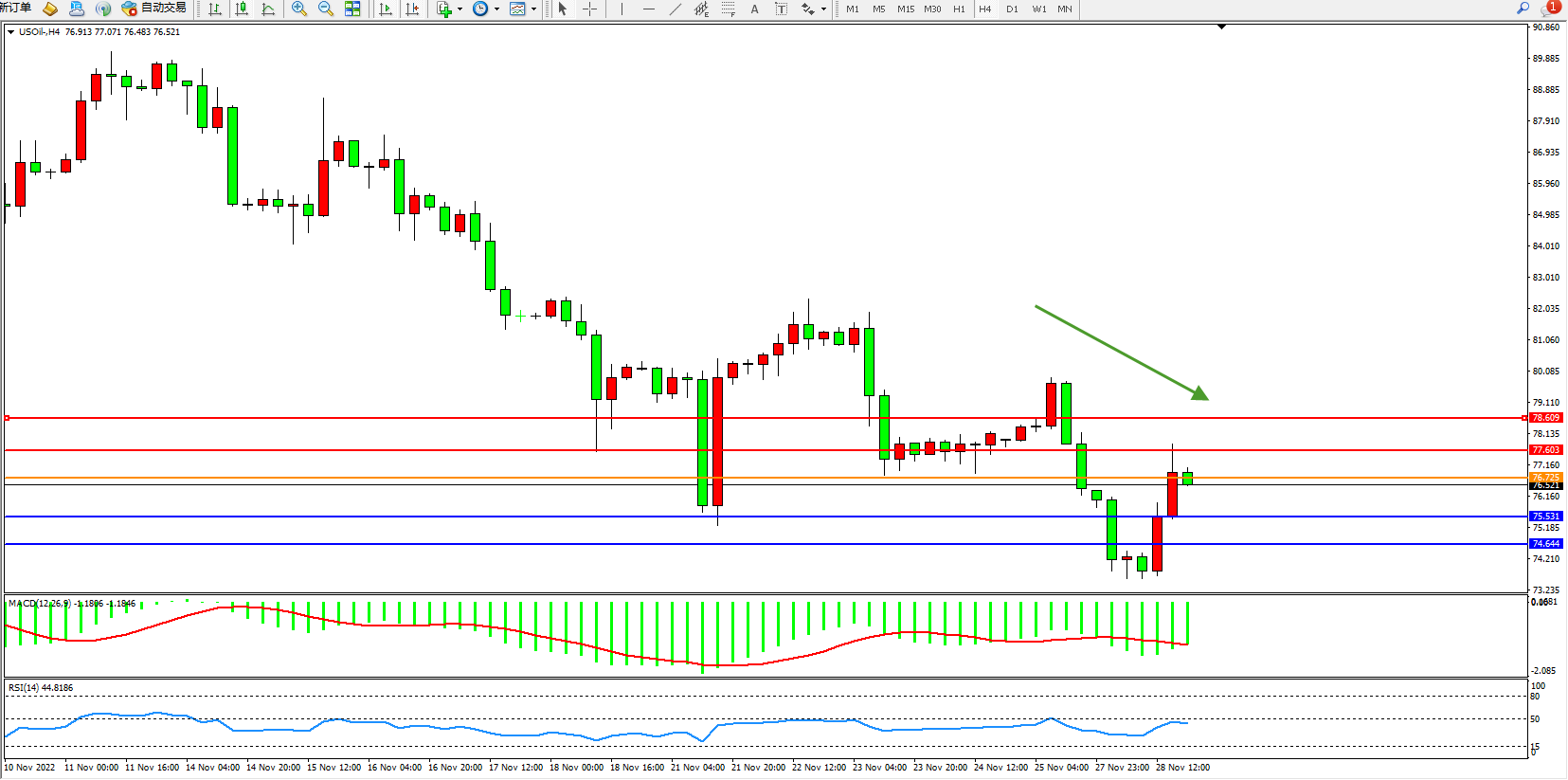 交易策略:76.725下方看跌,目标75.531、74.644