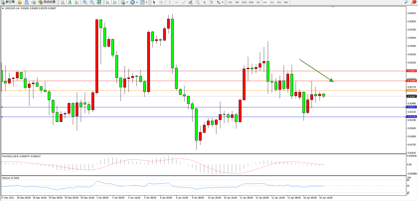 美元瑞郎USDCHF——4小时K线图显示: