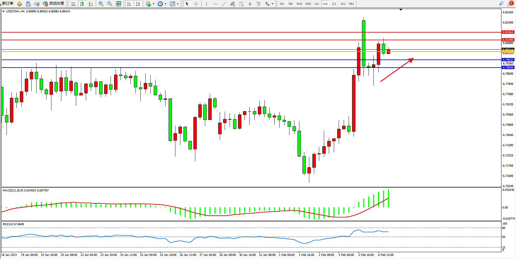 交易策略:6.80494上方看涨,目标6.81098、6.81664