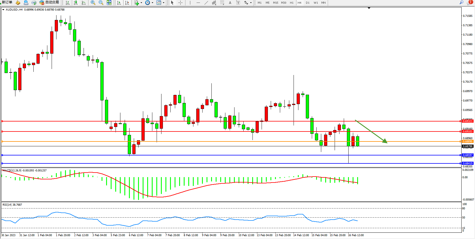 交易策略:0.68890下方看跌,目标0.68897、0.68419