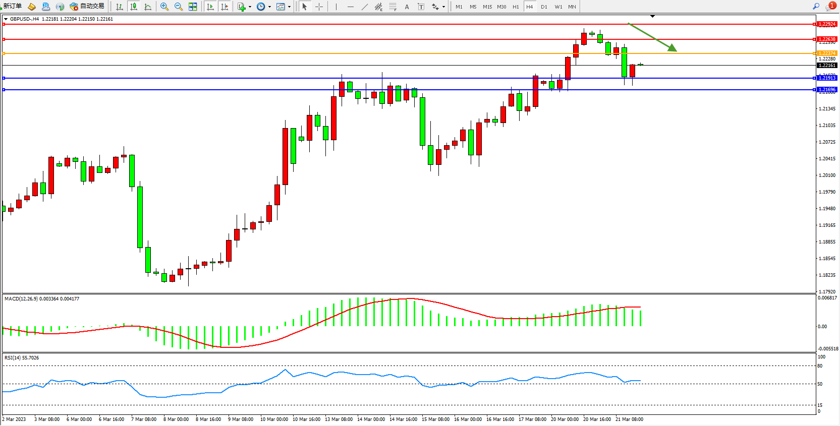 交易策略:1.22374下方看跌,目标1.21913  1.21696