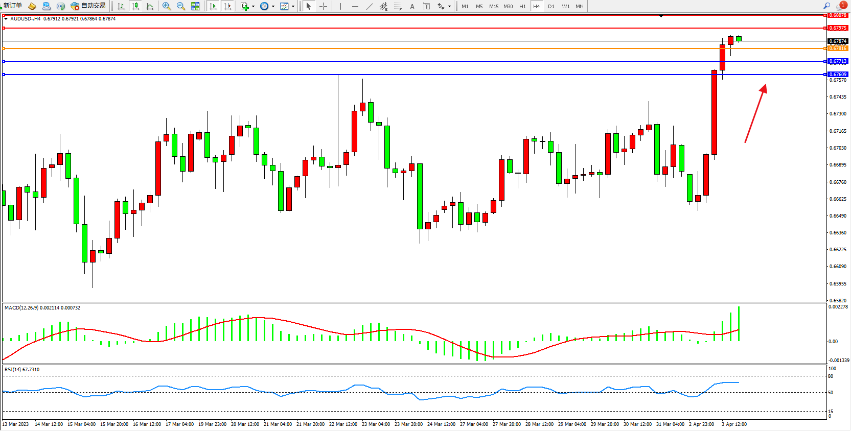 4小时图看:多头动力强势拉升,市场看涨情绪涌现,短期多头有继续攀升态势,MACD指标处于多头区域强势上扬,RSI指标处于多头区域高位徘徊;