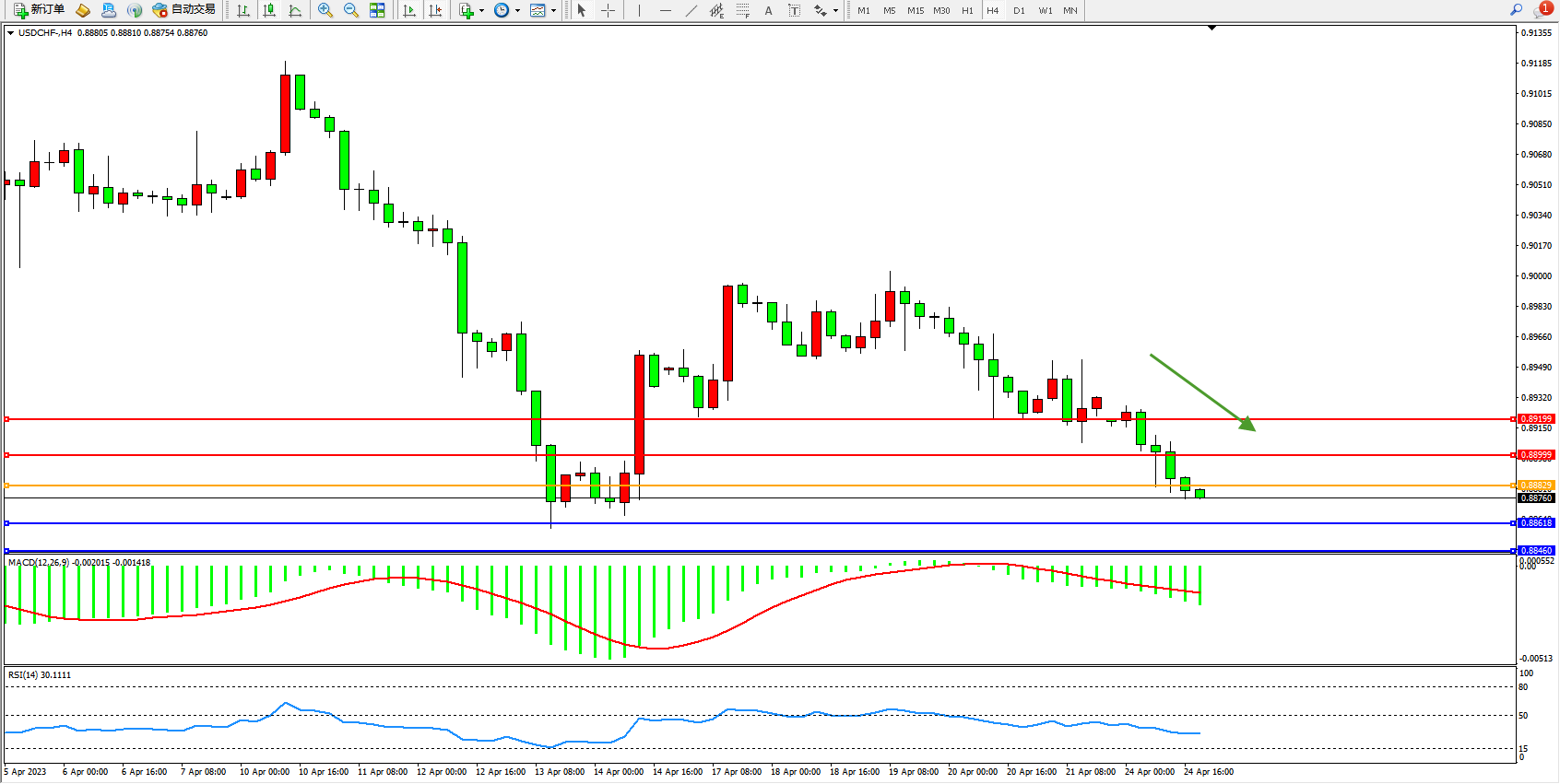 美元瑞郎USDCHF——4小时K线图显示: