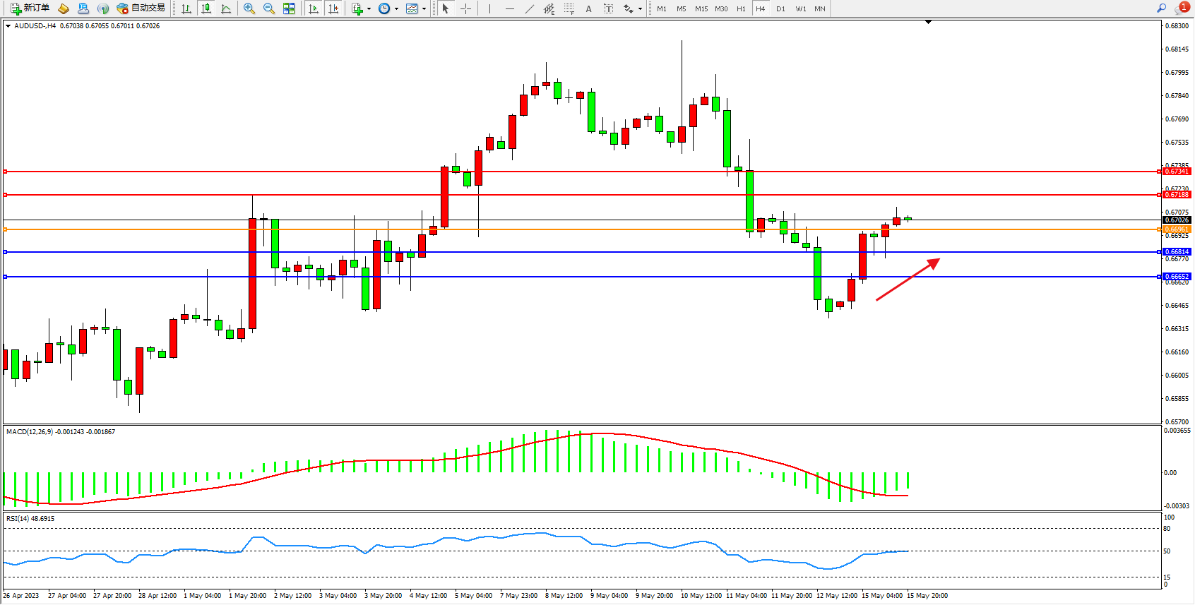 交易策略:0.66961上方看涨,目标0.67188  0.67341