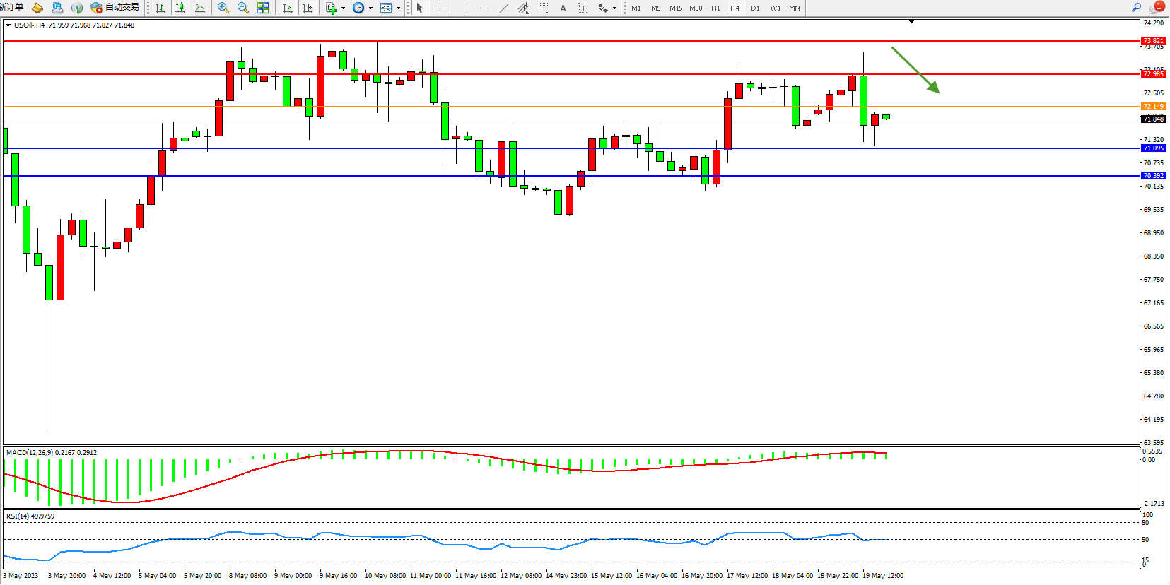 交易策略:72.149下方看跌,目标71.095 70.392