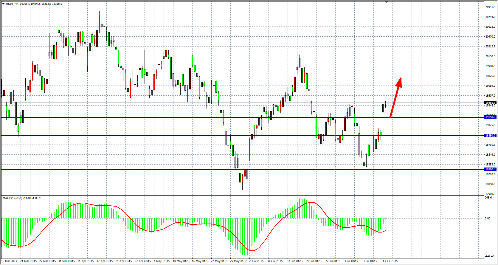 4小时图看,恒指在18850之上强势高开高走,MACD量能即将上穿零轴,多头表现强劲,支撑上移关注19150附近,该位上继续看涨19600-20000。