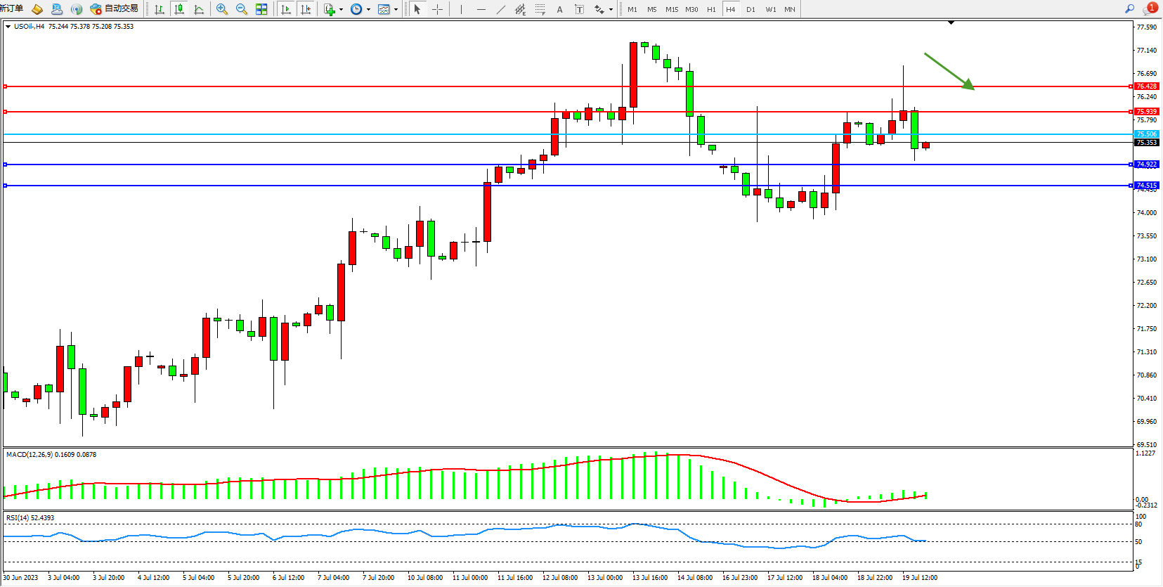 交易策略:75.506下方看跌,目标74.922  74.515