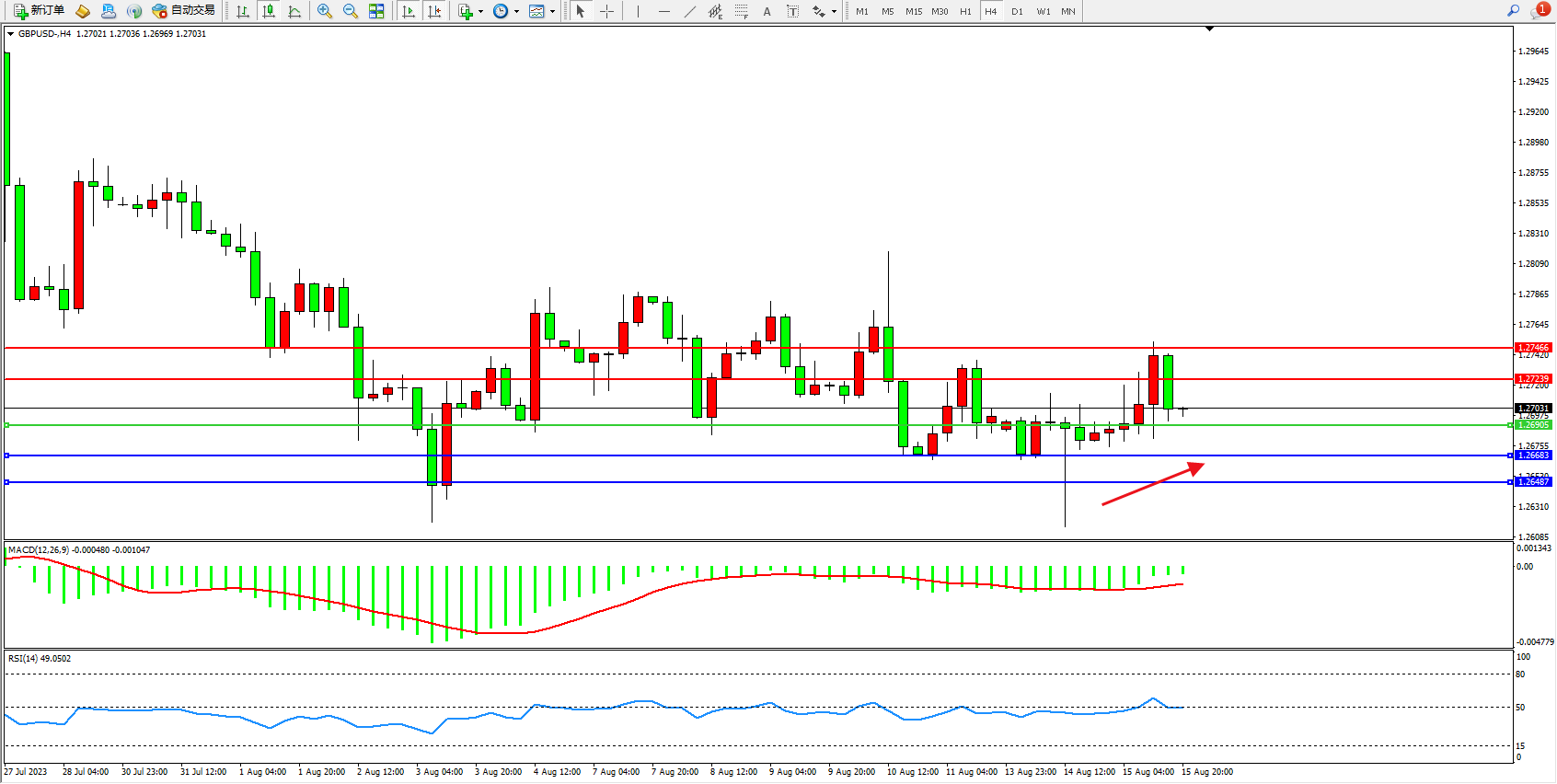4小时图看:多头动力维持震荡上移,短期看涨情绪依旧,MACD指标处于0轴线下侧徘徊,RSI指标处于50均衡线附近弱势整理;