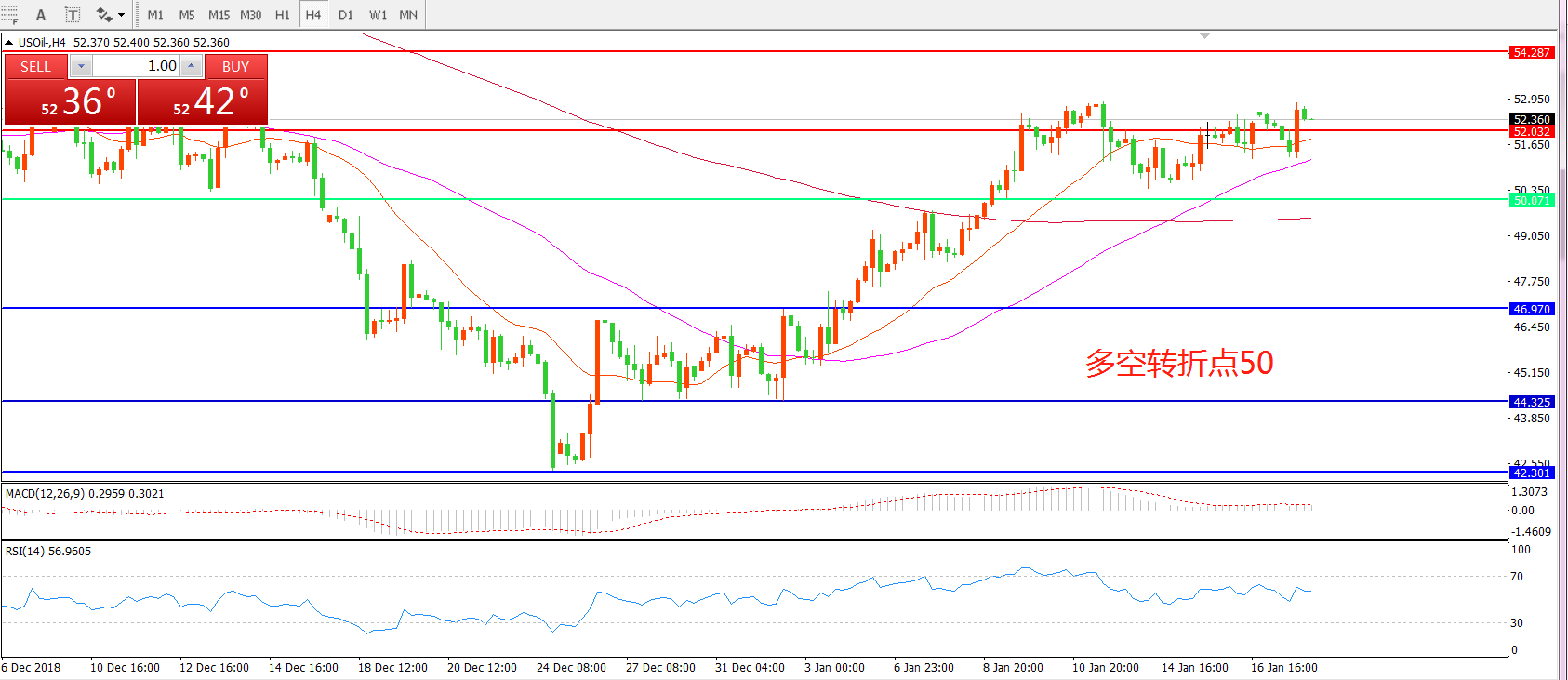 4时图看,油价经过连续整理突破52美元,但短期内依然呈现震荡形态, 均线系统呈多头排列,但MACD红柱缩短,重点关注55周期均线支撑。