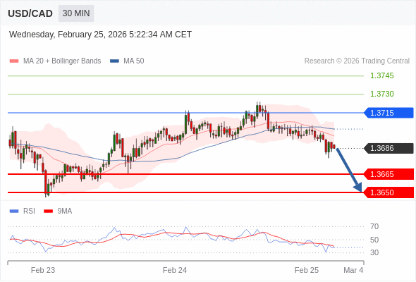在 1.3715 之下,看跌,目标价位为 1.3665 ,然后为 1.3650 。