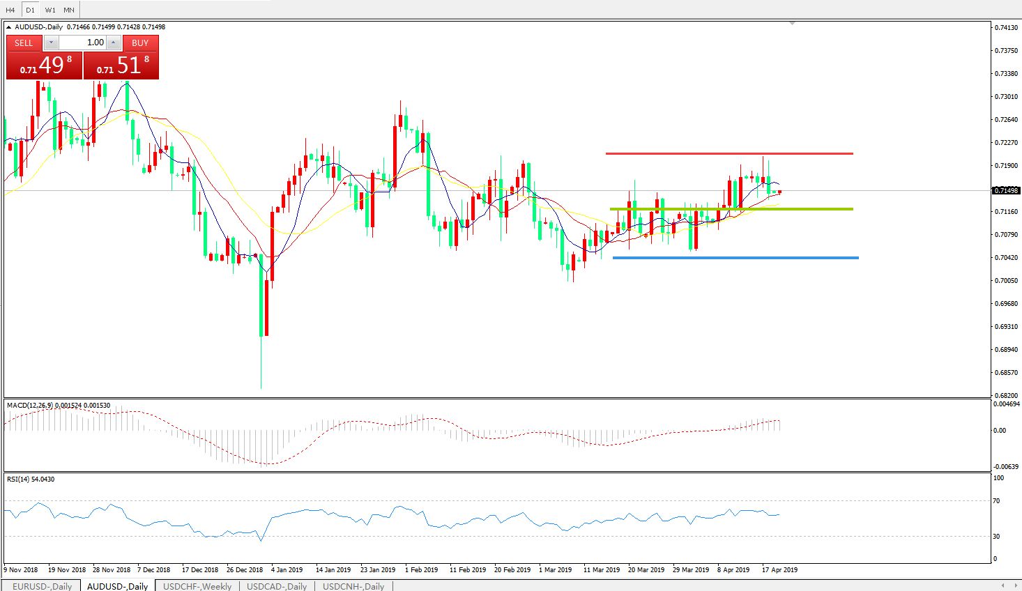技术面简析:日图均线有序多头排列,汇价冲高乏力后回落整理,MACD运行于0轴上方且动能柱放量,RSI小幅走低,预计汇价大概率将在整理蓄势后进一步上行。
