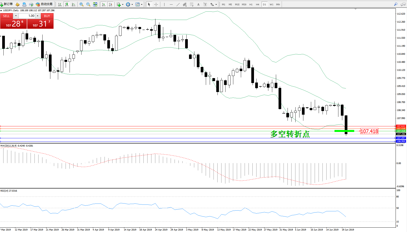 交易策略:107.418下方看跌,目标107.097、106.950
