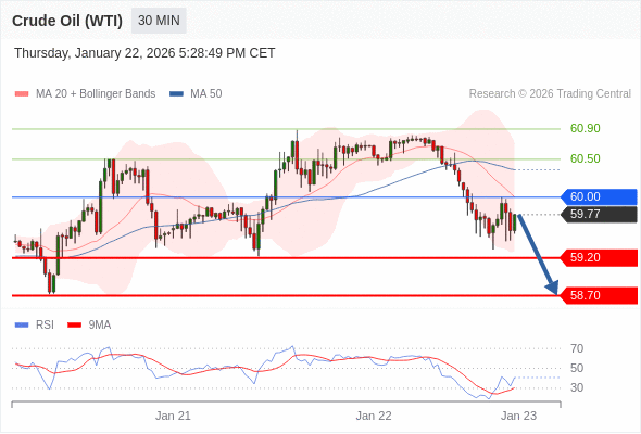 交易策略: 在 60.00 之下,看跌,目标价位为 59.20 ,然后为 58.70 。