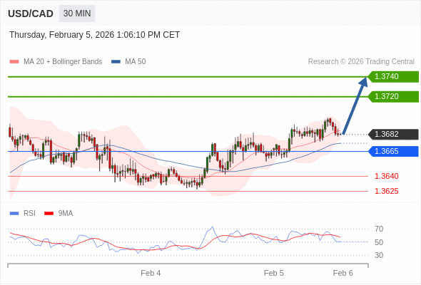 在 1.3665 之上,看涨,目标价位为 1.3720 ,然后为 1.3740 。