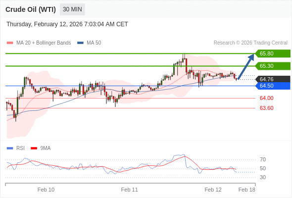 在 64.50 之上,看涨,目标价位为 65.30 ,然后为 65.80 。