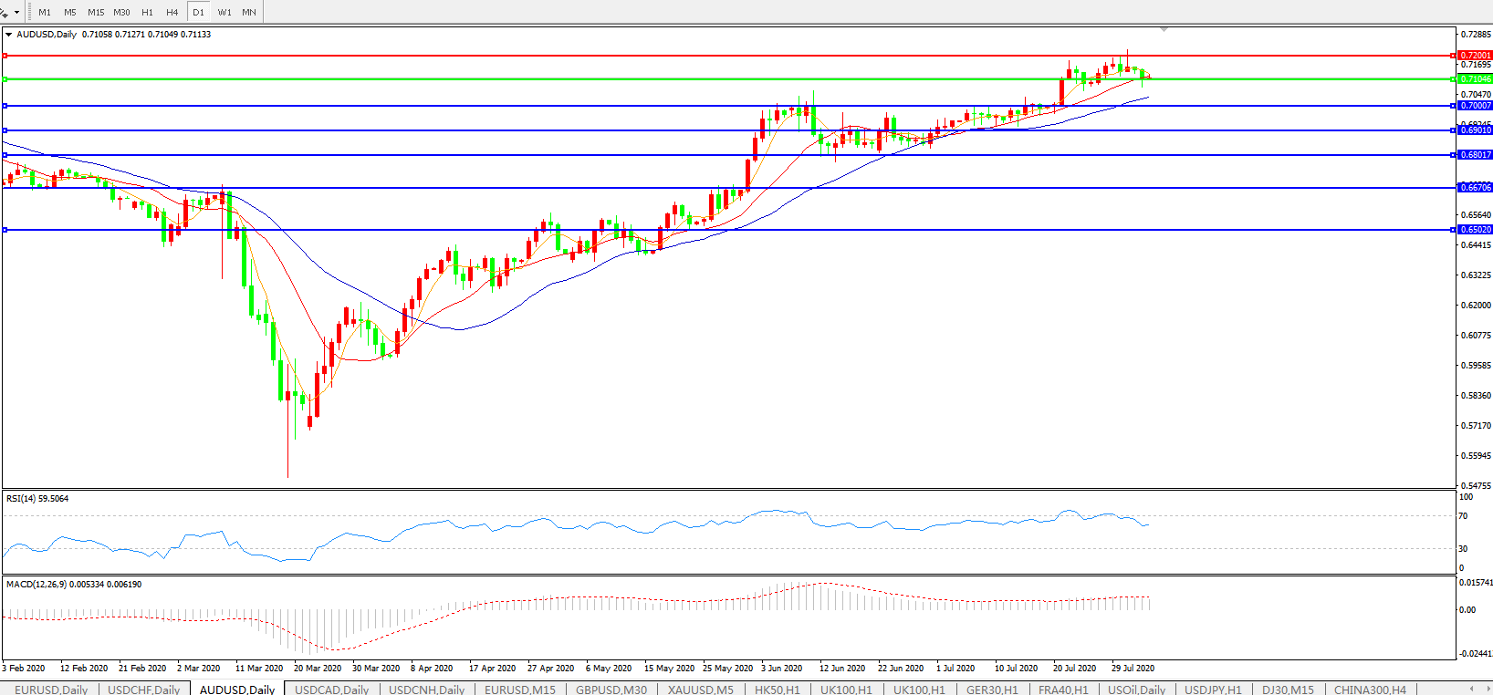 全球新冠病例数增多推动了周一多个货币的走势,澳元兑美元下跌0.27%至0.7124;稍早曾跌至0.7076,此前澳大利亚维多利亚州因近期病例激增而宣告灾难状态;止损卖盘预计在0.7000。澳洲联储已经将官方现金利率(OCR)降至其设定的下限0.25%水平,因此我行认为其政策利率不会进一步下调,澳洲联储主席洛威也暂时排除了负利率的可能性。预计澳洲联储的重点仍将牢牢放在确保债券市场有足够的流动性和信贷自由流向家庭和企业上。