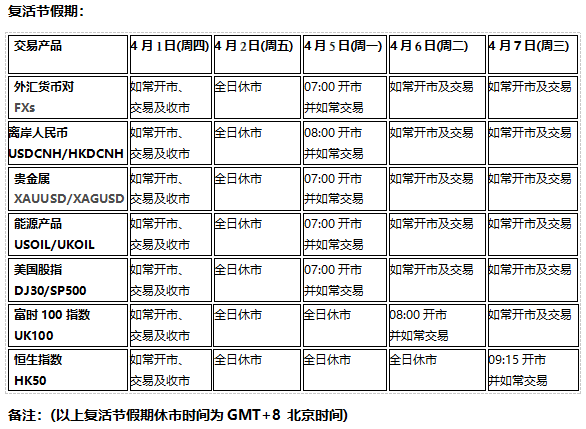 因应4月2日(周五)欧美市场耶稣受难复活节假期及4月4日(周日)中国市场清明节假期,以下产品的交易将于假期期间休市,敬请知悉留意!