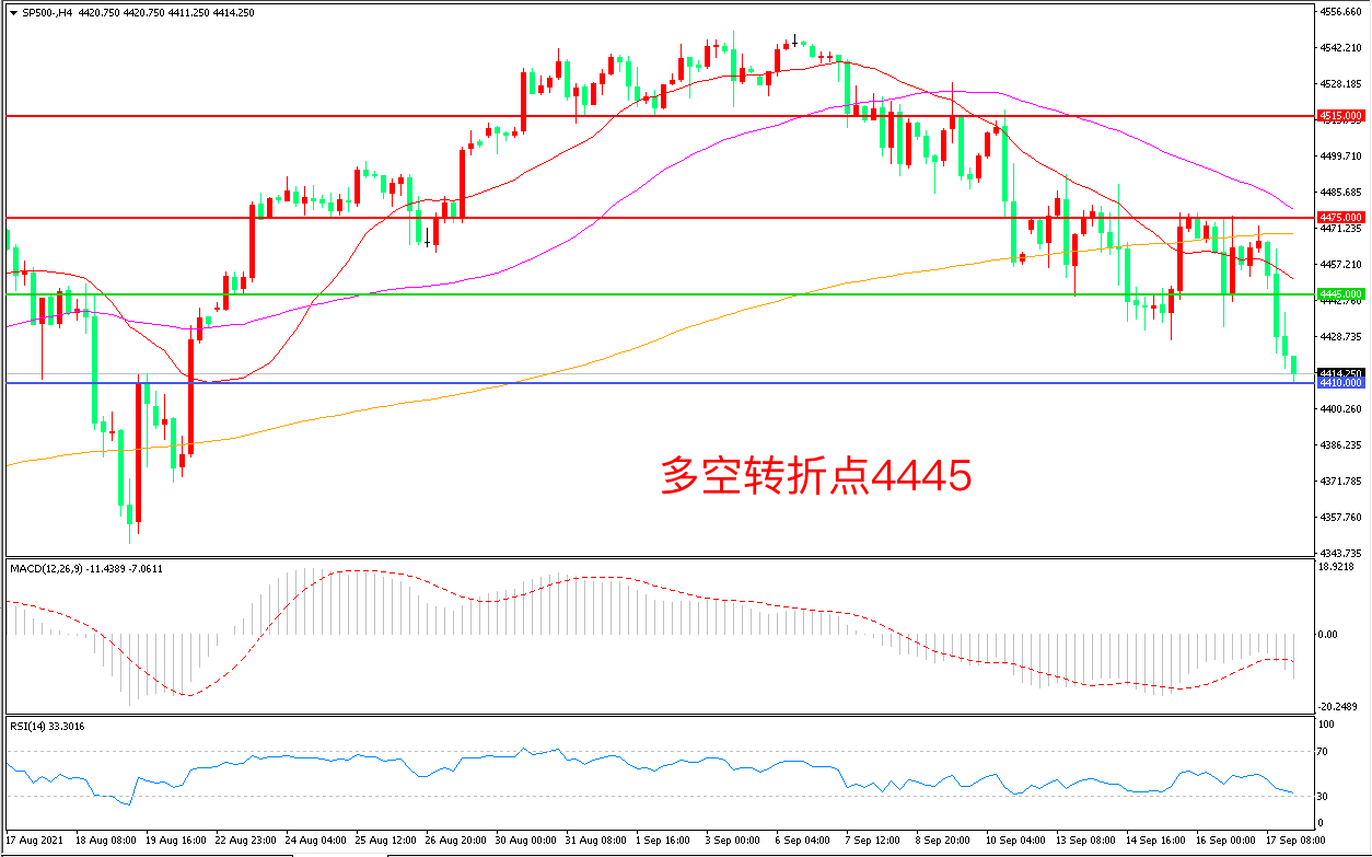 上周五(9月17日),拜登加强针计划受挫,债务危机的担忧也在加剧,多重利空影响下,三大股指齐跌,标普500大幅回落后收报4414.25点。目前市场投资者都在关注美联储9月的利率决议,本次决议将有经济预期和点阵图公布,如果美联储再次发出鹰派表态,标普500指数可能再次出现大跌。