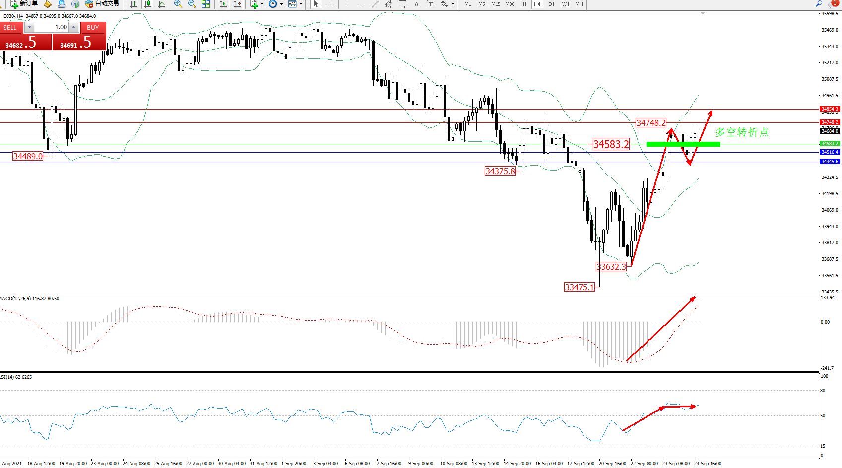 交易策略:34583上方看涨,目标34748、34854