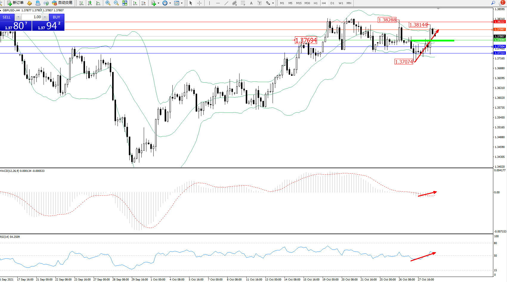 交易策略:1.37694上方看涨,目标1.37997、1.38222