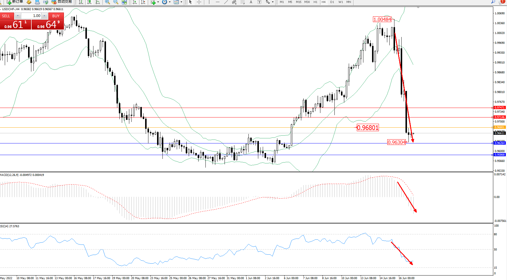 美元瑞郎USDCHF——4小时K线图显示:
